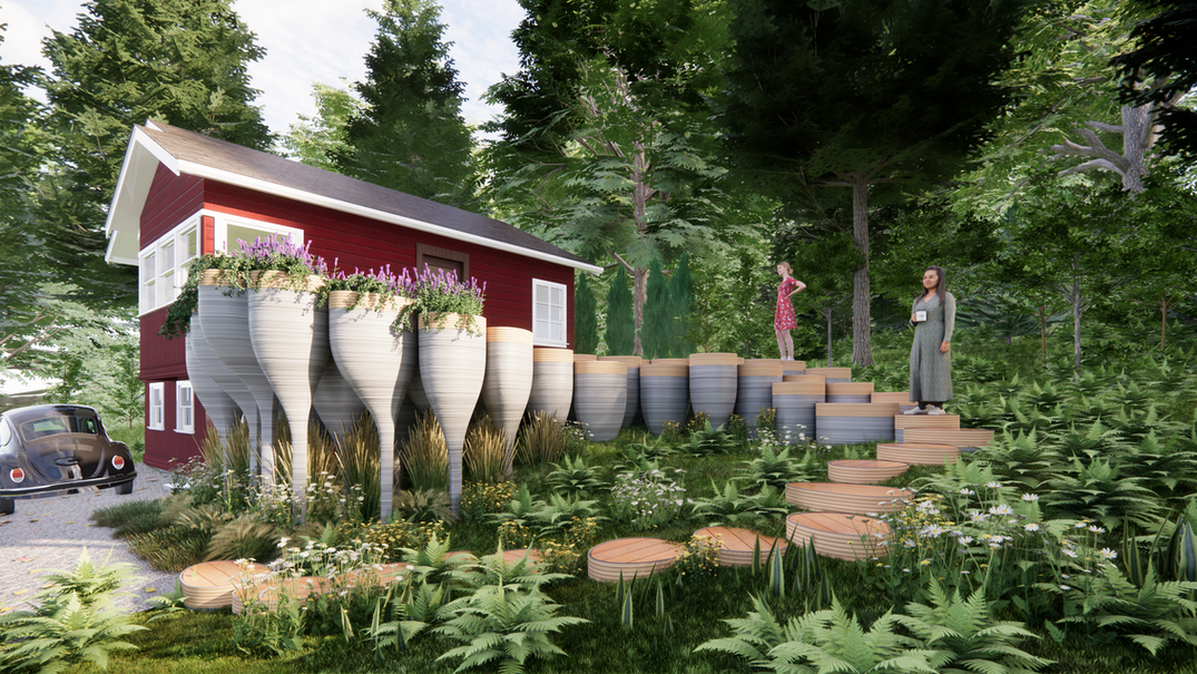 The second idea, Giants Stairway, draws inspiration from the natural topography of the area and features a winding staircase that leads down to the deck. The third design, Old Growth Mushrooms, draws inspiration from the local ecosystem and features elements that mimic the shape and texture of mushrooms found in the surrounding old growth forests.